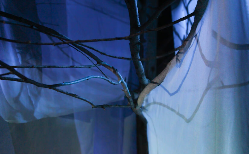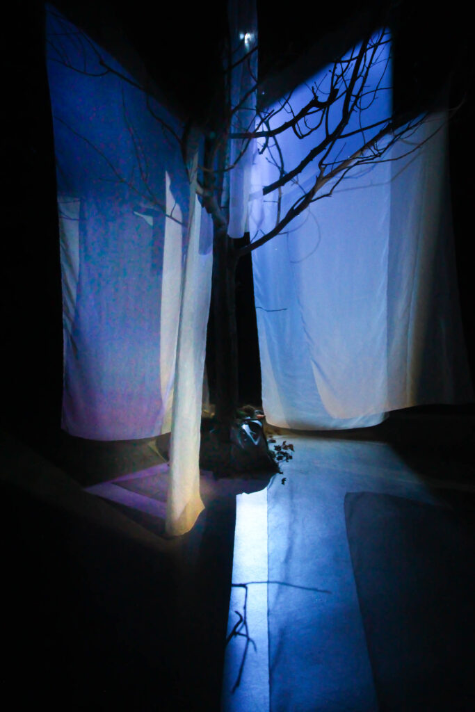 This work centres on a reconstructed tree, carefully disassembled and reassembled to fit within an interior space. From its branches hang lengths of white transparent chiffon, onto which a 30-minute real-time video of the rising dawn is projected from above. A 5.1 surround sound composition fills the space, immersing the viewer in a layered sonic and visual atmosphere.